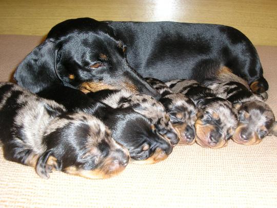Quenny vlastně původně vůbec nebyla určena pro nás. Chtěli jsme jí pro naší švagrovou, přála si štěně, ale nakonec se ukázalo, že tíhne spíše k drsnosrstým jezevčíkům a tygrovaná barva právě narozených štěňátek jí upřímně vyděsila :-) Nás naopak zcela uchvátila a protože získat štěně od Katky Kovalčíkové není vůbec jednoduché (kandidáti na "páníčka" procházejí pečlivým výběrovým řízením), rozhodli jsme se nepromarnit šanci a novou "flekatici" si nechat sami. Nutno dodat, že jsme svého rozhodnutí doposud jedinkrát nezalitovali, získali jsme úžasného ďáblíka, naprostý protipól Aidy, se kterým se rozhodně nikdy nebudeme nudit ;-)