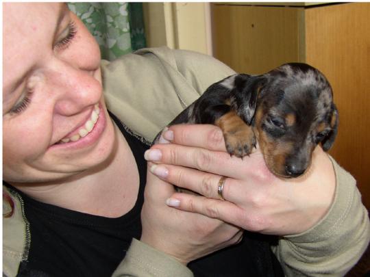 2007/02 - Quenny ještě u maminkyQuenny vlastně původně vůbec nebyla určena pro nás. Chtěli jsme jí pro naší švagrovou, přála si štěně, ale nakonec se ukázalo, že tíhne spíše k drsnosrstým jezevčíkům a tygrovaná barva právě narozených štěňátek jí upřímně vyděsila :-) Nás naopak zcela uchvátila a protože získat štěně od Katky Kovalčíkové není vůbec jednoduché (kandidáti na "páníčka" procházejí pečlivým výběrovým řízením), rozhodli jsme se nepromarnit šanci a novou "flekatici" si nechat sami. Nutno dodat, že jsme svého rozhodnutí doposud jedinkrát nezalitovali, získali jsme úžasného ďáblíka, naprostý protipól Aidy, se kterým se rozhodně nikdy nebudeme nudit ;-)