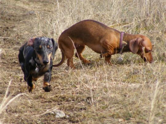 Na speciální výstavě jezevčíků v Holýšově se dařilo zejména Quenny, která získala ocenění V1, CAJC. Aida se panu rozhodčímu moc nezdála kvůli špatnému osrstění (opět jsme narazili na starý problém: zima+pes v posteli=žádná srst), takže získala ocenění "pouze" výborná. Aby měli z výletu nějakou radost i pejsci, zastavili jsme se cestou v lese poblíž Koněpruských jeskyní, kde se holky vylítaly a já udělala pár fotek.