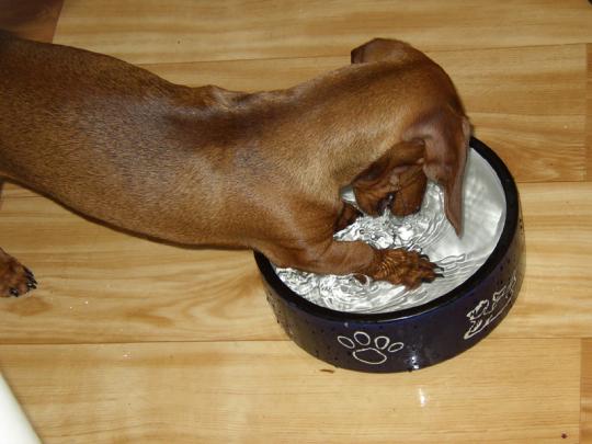 Aida se rozhodla, že vyloví dekoraci keramické misky :-) Způsobila sice malou potopu, ale tak si to užívala, že jsme jí tu zábavu nemohli překazit.